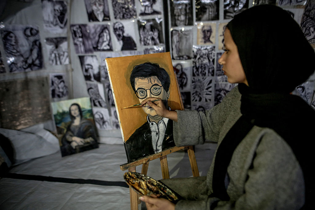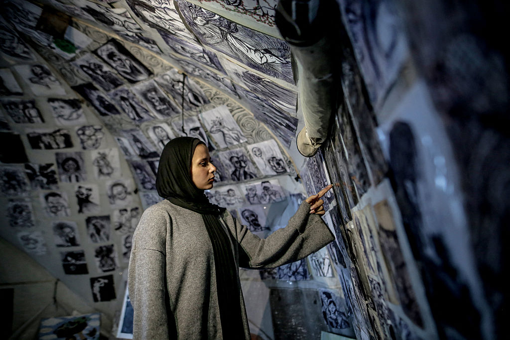 حوّلت الفنانة مرح الزعانين ابنة الثمانية عشر عامًا، خيمتها المشيدة في إحدى مدارس "أونروا" إلى معرض فني، يحوي لوحات وثّقت فيها أحداث الحرب والمجاعة والنزوح، وأعربت عن طموحها بافتتاح معرض فني كبير يوصل رسالتها إلى العالم.