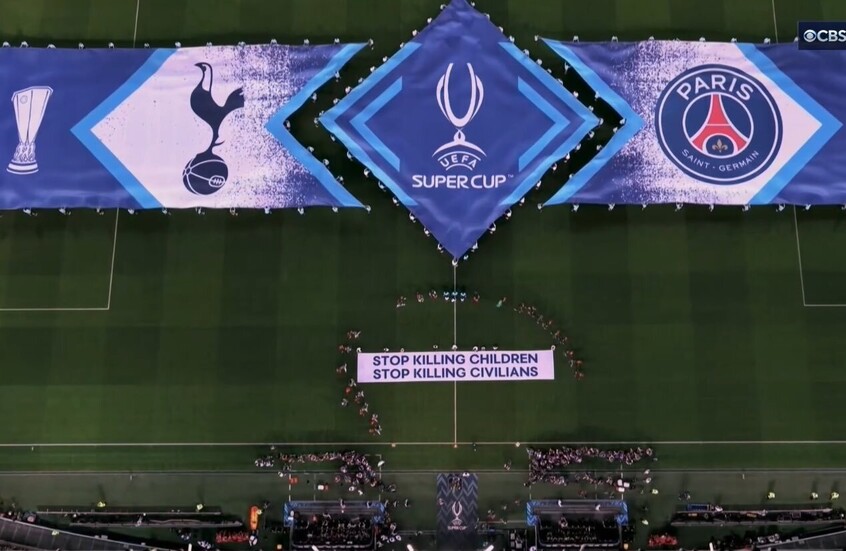 وجه الاتحاد الأوروبي لكرة القدم "يويفا" رسالة إنسانية قوية بشأن الحرب في غزة قبل انطلاق مباراة السوبر الأوروبي بين باريس سان جيرمان وتوتنهام على ملعب فريولي بمدينة أوديني الإيطالية