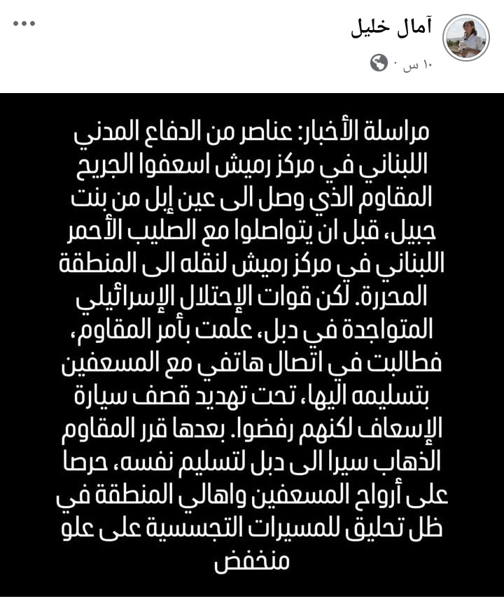 وقبل دقائق من استشهادها، نشرت آمال خليل تدوينة عبر حسابها على موقع فيسبوك، أوضحت فيها أن "عناصر من الدفاع المدني اللبناني في مركز رميش أسعفوا الجريح المقاوم، الذي وصل إلى عين إبل من بنت جبيل، قبل أن يتواصلوا مع الصليب الأحمر اللبناني في مركز رميش لنقله إلى المنطقة المحررة".